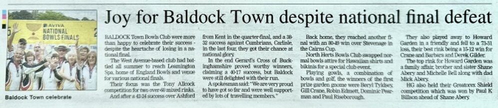 Club News - 1st December 2025We are wishing all our Club Members and Families and our Friends a Very Merry Christmas 2025! & Happy New Year 2026Club News 22nd September 2025The Last of the Letchworth & District Finals was played this week. In the Fours Final between two Baldock Teams, it came down to the last bowl. Steve Budge, Martin Roberts, Paul Andrews and Sam Andrews won by 1 shot against Dave Davis, Ian Chambers, Brian Todd and Mike Parsons.We were Runners-up in the Stevenage & District Mixed Bowls League for 2025, That’s it for this season. BTClub News 15th September 2025We had a very busy weekend. In the final stages of The County League we beat Garston by 8 shots in the semi final. In a very tense final we lost by 2 shots against Buntingford. In the Letchworth and District Finals we were very well represented. In the singles final Paul Andrews beat his son Sam. The pairs final was also an all Baldock affair with Lorcan Saunders and Darren Hickin beating Steve Budge and Aaron Heath on an extra end. The Triples Final saw Harry Undrell, Martin Roberts and Hayden Chambers beating a team from Royston. The Fours final was postponed due to a flooded green. In a friendly game we beat Henlow 81-77. BTClub News 9th September 2025In our Club Finals weekend here are our winners - Ladies Champion Megan Mackinnon, Men’s Champion Martin Roberts, Open Sets John Graham, Men’s Handicap Sam Andrews, Ladies Handicap Sarah Berry, Fixed Jack-Wendy Budge, Graded Pairs - Matt Hayzelden and Hayden Chambers, Open Pairs - Ian Chambers and Sam Andrews, Challenge Shield - Matt Undrell, Men’s Two Bowl - Sam Andrews, Ladies Two Bowl- Julie Undrell, and Open Triples - Julie Mutter, Sofie Harrington(reserve), Matt Hayzelden and Harry Undrell. Elsewhere In friendlies we beat Letchworth 98-35 and a touring team from Gravesend 126-48. BTClub News 1st September 2025The Hertfordshire County North Area League Finals took place at Baldock this weekend.In the Semi Final our Team beat St.Ippolyts 52-15 and in the Final we beat Stevenage 36-24. We will now play the County Finals at Garston later this month.In the Stevenage Mixed League in our final game, we beat Howard Garden 55-47 gaining 4 points to 2.Although we currently retain our top position there are teams with games in hand that can catch us. BTHertfordshire County North Area League Champions 2025Right to Left: Darren Hickin, Sam Andrews, Matt Hayzelden, Aaron Heath, Hayden Chambers, Jamie Claydon, Lorcan Saunders, Steve Budge.Club News - 25th August 2025In the North Herts Ladies Finals we lost the Challenge Shield to Stevenage 1-3 with Ness Graham winning the Singles. In the Triples Competition Wendy Budge, Mary Ann Haskins and Kim Dear won the Triples against Letchworth. On Wednesday we had our first Gala for over 25 years. It was a huge success with 24 teams taking part. The winners were a rink from Stevenage. We won the Cairns Cup against Royston 63-51. We have now won it for the last three years. In the Stevenage Mixed league we beat Royston 36-35 and Howard Garden 75-30 gaining 11 points out of 12. In a friendly game we beat Buntingford 70-36.Letchworth & District Cairns Cup Winners 2025Back Row: Lorcan Saunders, Matt Hayzelden, Jamie Claydon, Paul Andrews, Steve Budge, Aaron Heath. Front Row: Sam Andrews, Harry Undrell.Club News - 21st August 2025The National Bowls Championships are currently being held at Leamington Spa. In the Tony Allcock Competition (two over 60 mixed rinks) we beat Ashford in Kent 42-24 in the Quarter Final. The semi-final saw us beat Carlisle in Cumbria 38-32. In the National Final we were beaten 17-40 by an excellent side from Gerard’s Cross. We are very proud to have got so far and were well supported by lots of travelling members. In the Cairns Cup semi final we beat Stevenage 80-49. BTFront Row - Paul Haskings, Kim Dear, Carol Pomfrey, Janet Turner, Ness Graham.Back Row - Brian Todd, Terry Godden, Mike Parsons, Rose Castle.National Bowls Finals 2025 - Tony Allcock Trophy Runners-up